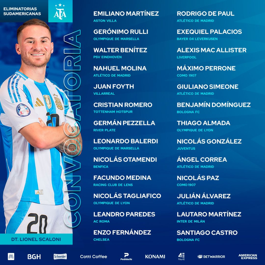El capitán argentino no estará en la doble fecha de Eliminatorias rumbo al Mundial 2026. Esta es la lista que presentó Scaloni.