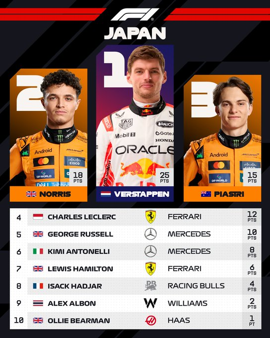 La carrera en Japón dejó a Lando Norris como líder del Mundial, con apenas un punto de ventaja sobre Max. Verstappen, que consiguió su cuarto triunfo consecutivo en Suzuka.