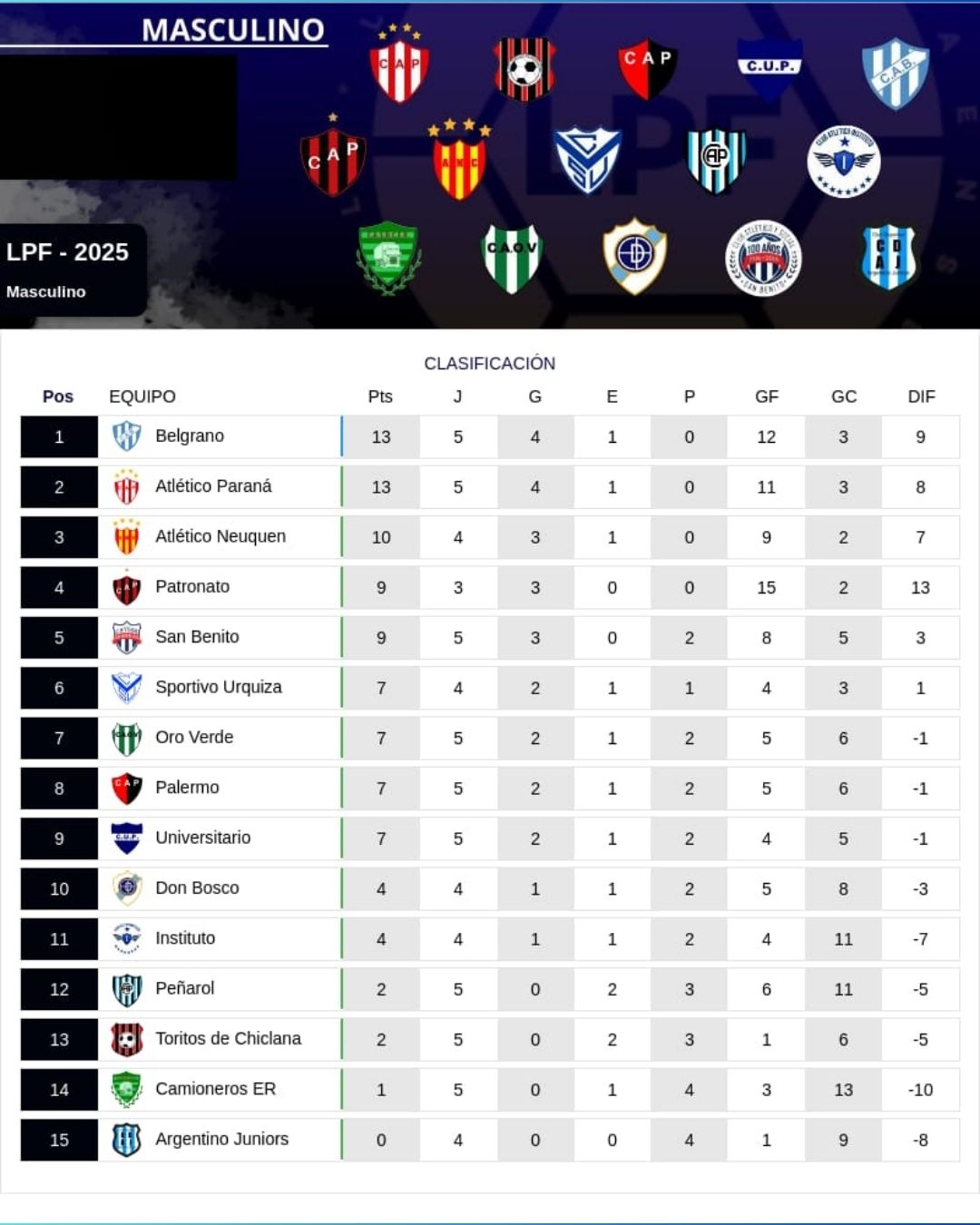 En la tarde de este sábado se disputo una nueva fecha de la Copa de la Liga Paranaense de Fútbol (LPF) y correspondió a la quinta fecha. Belgrano y Atlético Paraná continúan liderando el torneo al obtener el triunfo en sus correspondiente encuentros.