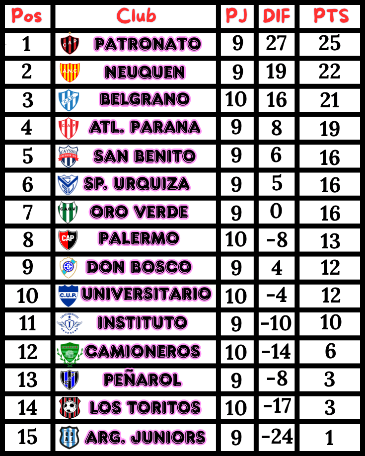 Este resultado, deposita a Patronato como puntero absoluto con 25 puntos en la tabla de posiciones y su rival de turno ocupa el fondo de la tabla con 1 punto. Neuquén es el único escolta con 22, mientras que en el tercer escalón lo ocupa Belgrano con 21 puntos.