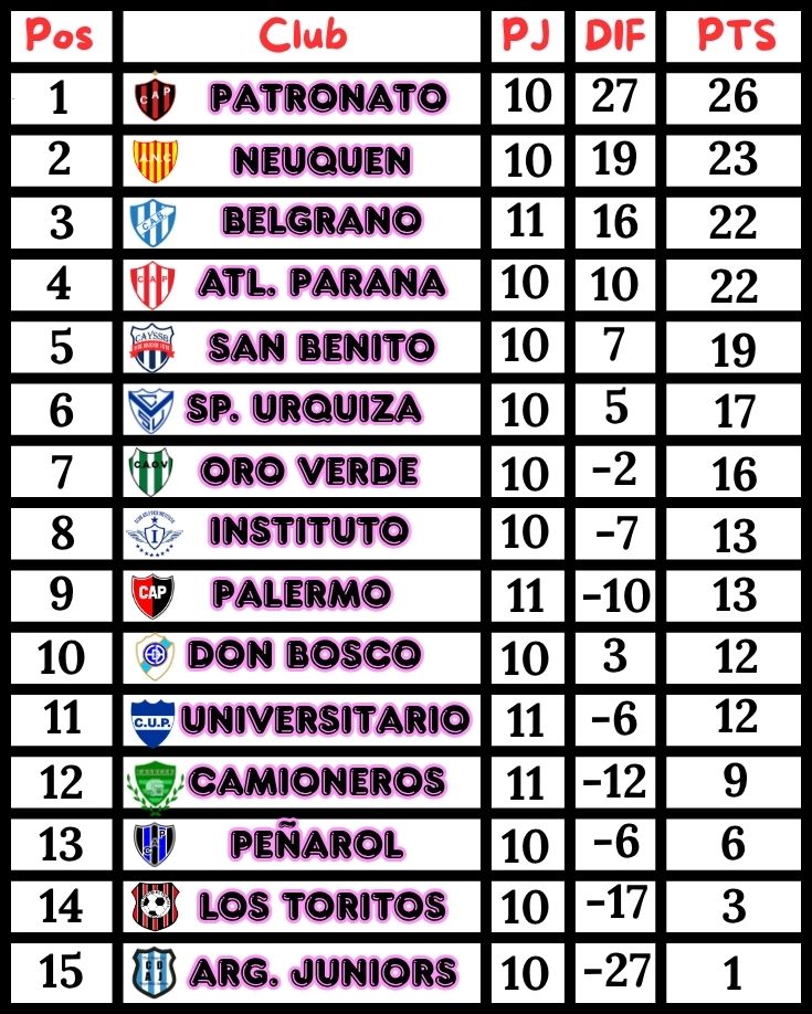 Este resultado no afecto el liderazgo al Rojinegro, que llegó a 26 puntos y continúa comandando la tabla de posiciones de forma invicta. Esto se debe a que el empate entre segundo y tercero no afecto las diferencias, Belgrano y Neuquen igualaron 1-1 y es así por lo que no pudieron recortarle distancia a Patronato. El Pingüino aparece segundo con 23 y el Mondonguero está tercero con 22 unidades.