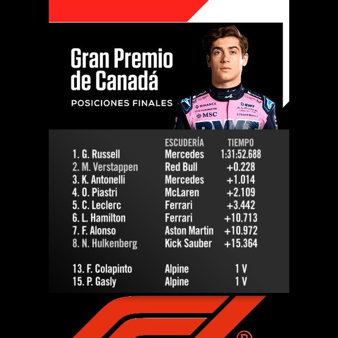 La victoria fue de George Russell, quien se impuso sobre Max Verstappen, mientras que Andrea Kimi Antonelli logró su primer podio en la Fórmula 1 al llegar tercero. Colapinto, continua sumando experiencia y se afianza como uno de los novatos más sólidos del campeonato.