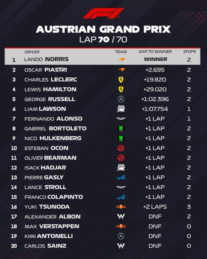 Franco Colapinto, fue penalizado en el GP de Austria, donde finalizo 15 en una carrera con abandonos y polémicas | Clasificación