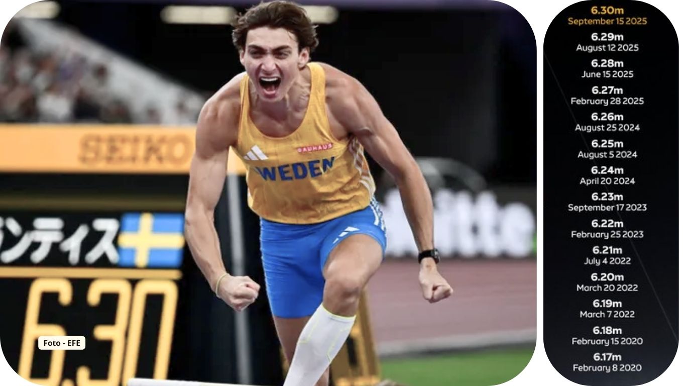 El estadounidense nacionalizado sueco, Armand Duplantis, rompió su propio récord y se consagró campeón mundial de atletismo por tercera vez consecutiva. El nacido en Luisiana hace 25 años, dejo atrás el récord vigente de 6.29 metros, para alcanzar los 6,30 metros.