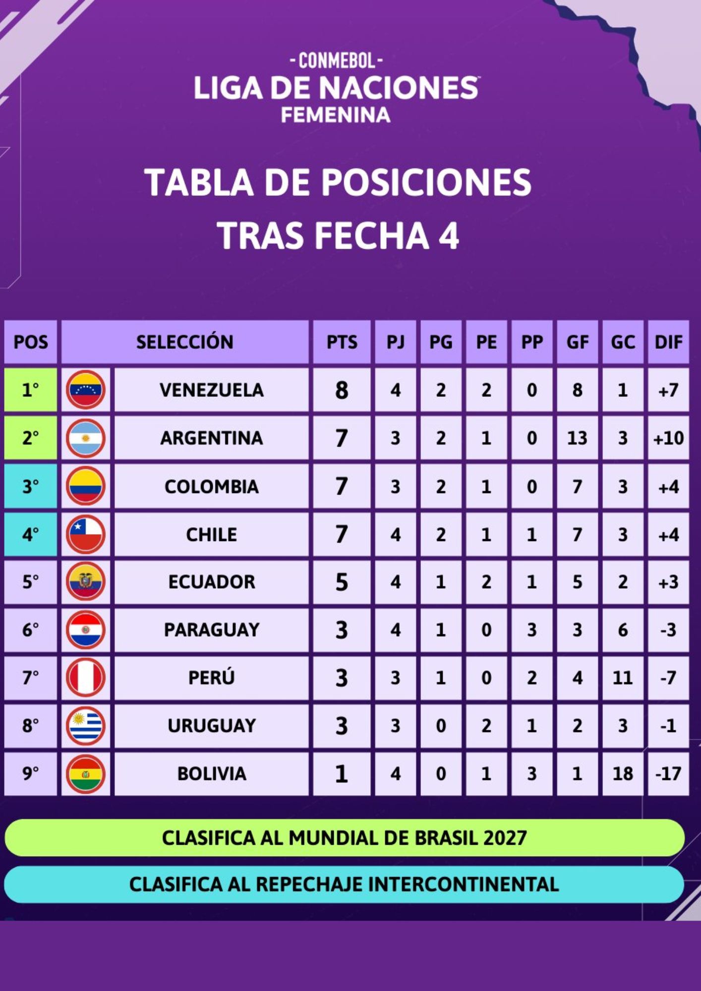 Los goles fueron de Kishi Núñez (2), Florencia Bonsegundo (2), Paula Gramaglia (2), Aldana Cometti y Francisca Altgelt. Bolivia, dirigida por Jury Villarroel, sigue última con 1 punto.