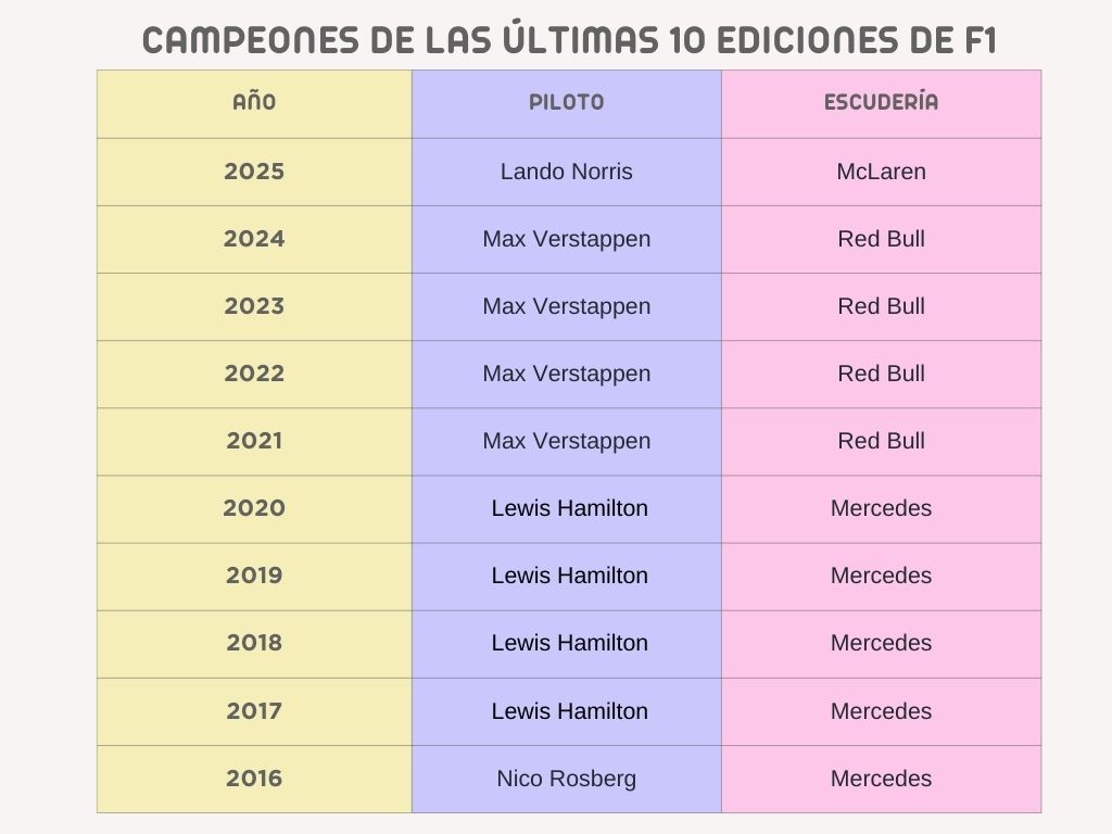 Lando Norris se consagró campeón de la Fórmula 1 2025 tras finalizar tercero en el Gran Premio de Abu Dabi. Clasifico detrás de Oscar Piastri y del ganador de la carrera, Max Verstappen, quien aun así no logró descontar los puntos necesarios para arrebatarle el título.