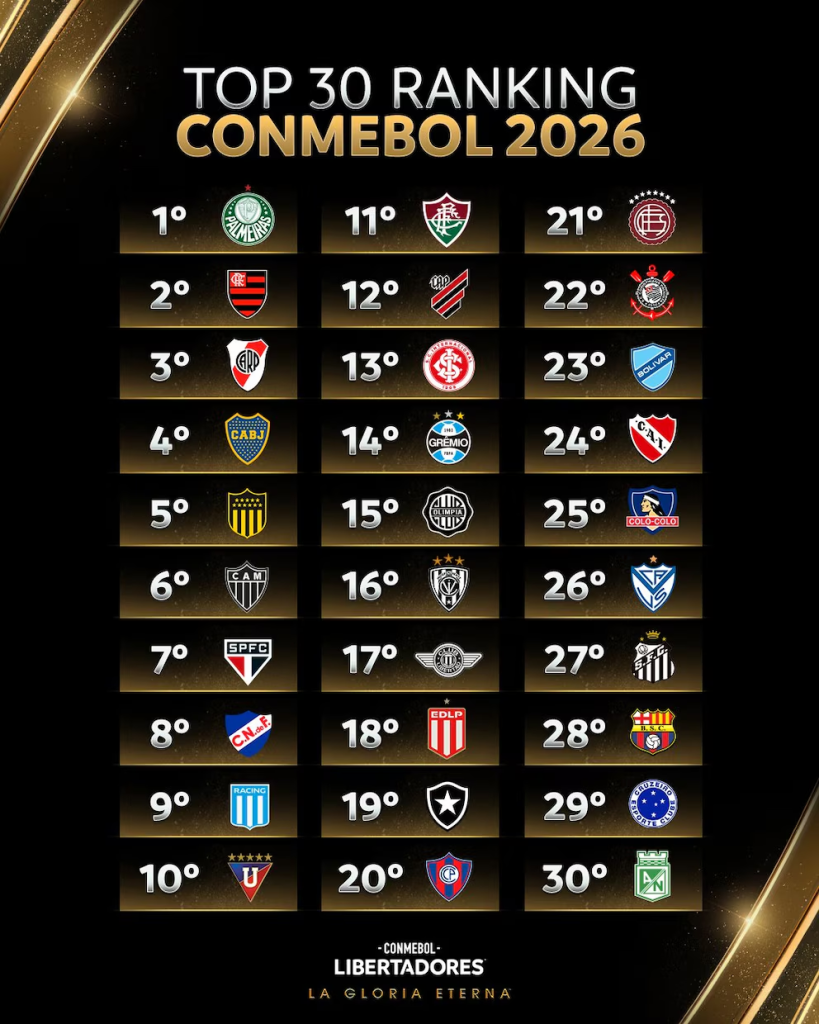 El ranking se calcula a partir de tres factores: el rendimiento en la Libertadores y la Sudamericana en los últimos diez años (con mayor peso para los más recientes), el coeficiente histórico acumulado y un bonus fijo por títulos de liga nacional. La suma de estos elementos define el orden final y los bombos para los sorteos continentales.
