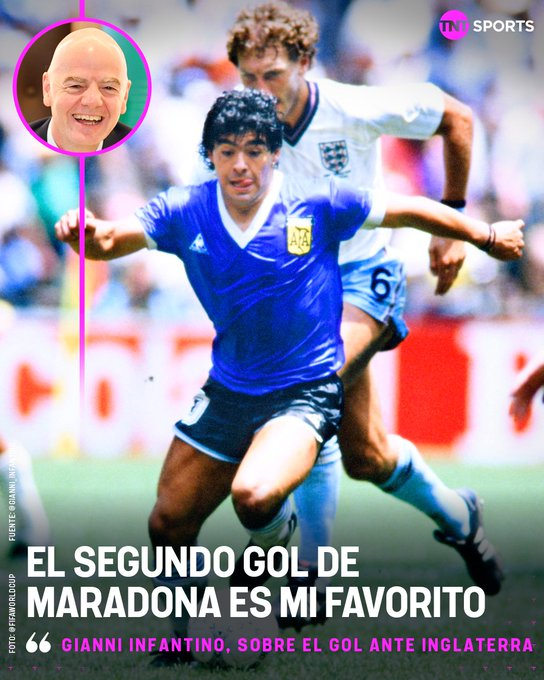 “¿Mi gol favorito en un Mundial? El segundo de Maradona contra Inglaterra. Yo no podría haber marcado un gol más bonito”, expresó Infantino.