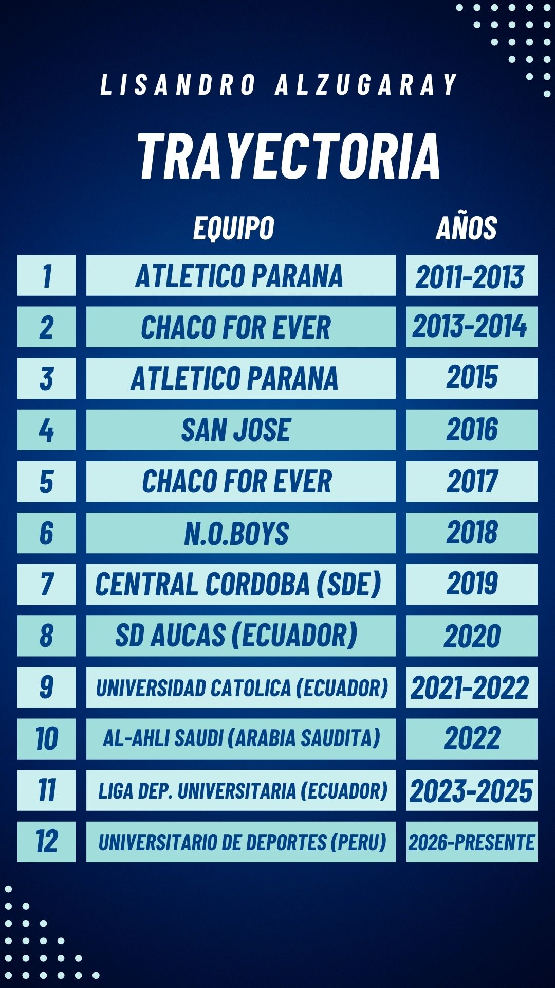 Con pasado en ligas de Argentina, Bolivia, Ecuador y Arabia Saudita, Alzugaray suma una trayectoria internacional que Universitario considera fundamental para afrontar los desafíos de la Liga 1 2026 y la Copa Libertadores, donde su experiencia y jerarquía serán un respaldo importante para el plantel crema.
