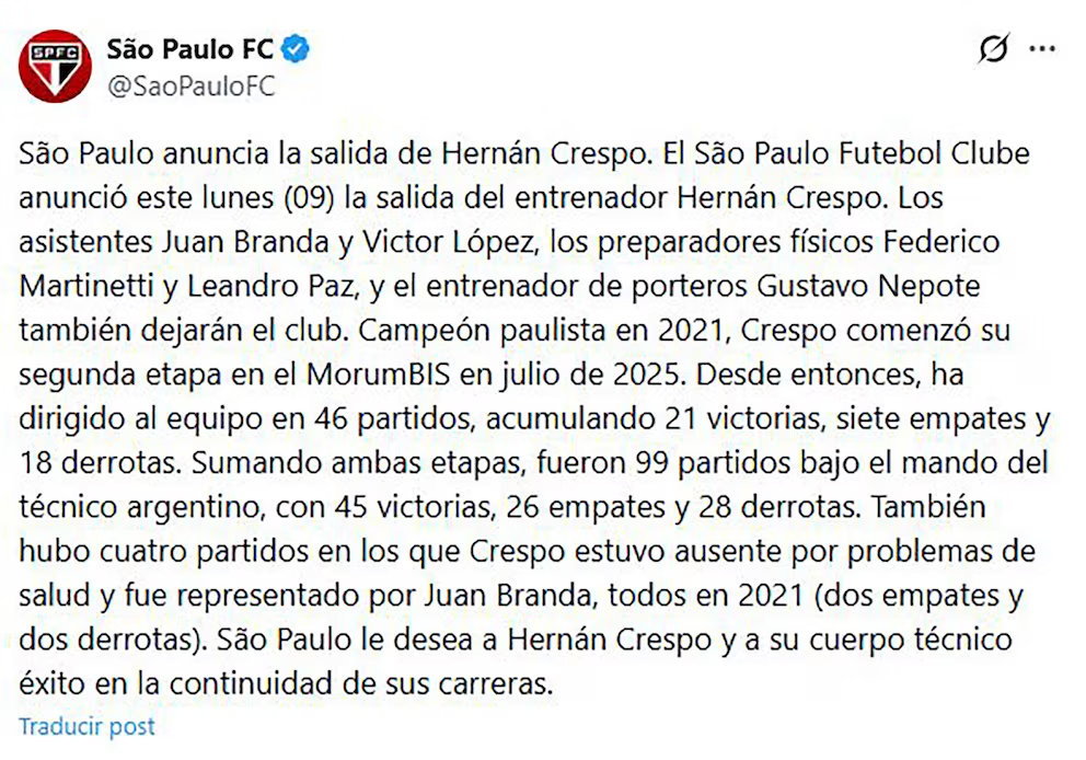 Durante su segundo ciclo, Crespo dirigió 46 partidos entre competencias locales e internacionales, con un balance de 21 victorias, 7 empates y 18 derrotas. Sumando su primera etapa en 2021 —en la que conquistó el Campeonato Paulista— acumuló un total de 99 encuentros al frente del equipo, con 45 triunfos, 26 igualdades y 28 caídas. Su salida marca un cierre inesperado para un entrenador que había dejado un buen recuerdo en el club.