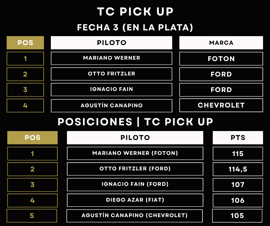 El entrerriano Mariano Werner volvió al triunfo en la 3° fecha del TC Pick Up disputada en el Autódromo Roberto Mouras de La Plata. Este triunfo le dio a la Foton Tunland G7 su primera victoria en la categoría.