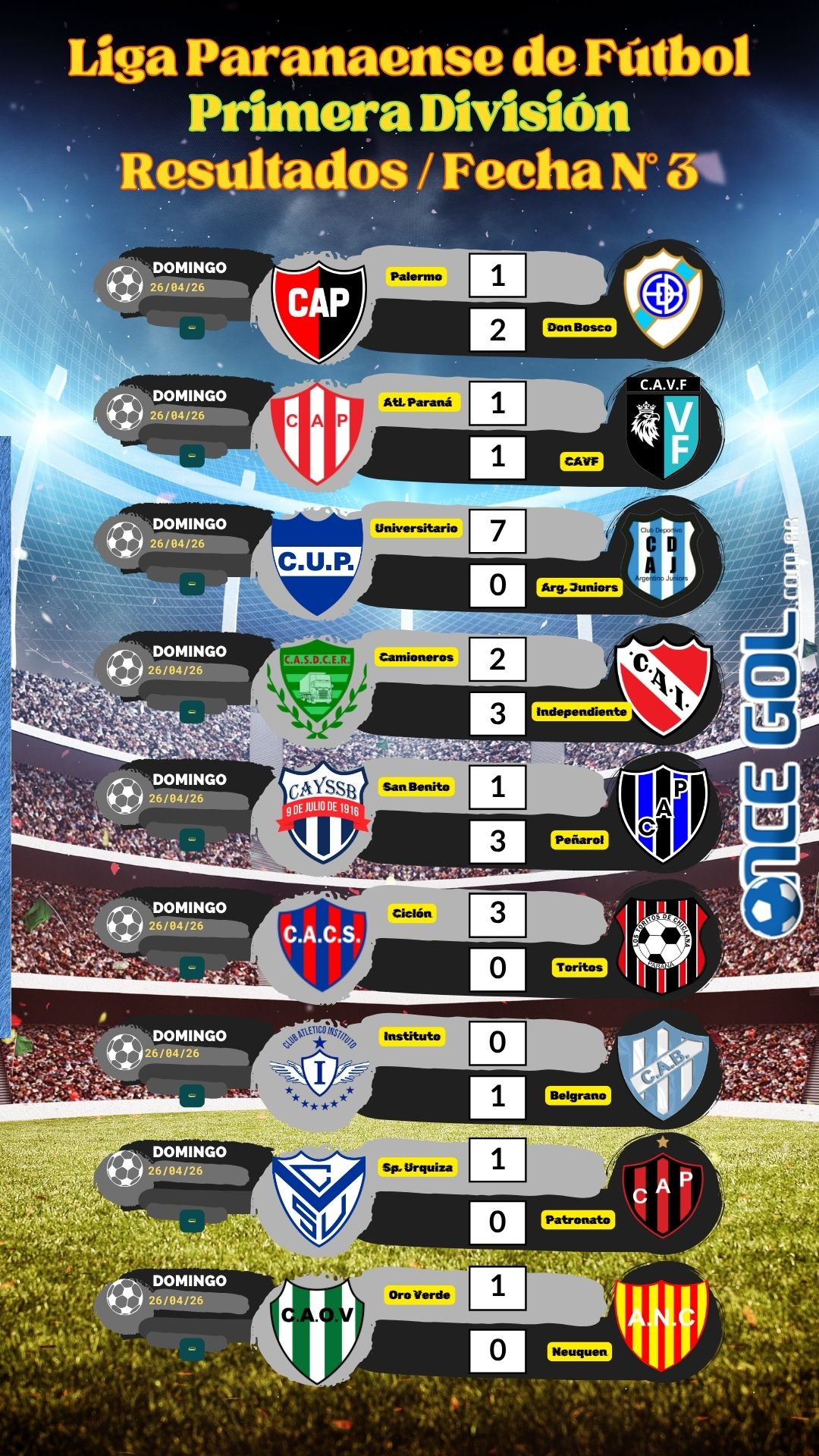 Este domingo se disputó de manera completa la tercera fecha de la Liga Paranaense de Fútbol. Esta jornada dejó cambios importantes en la cima de la tabla y redujo la cantidad de líderes.